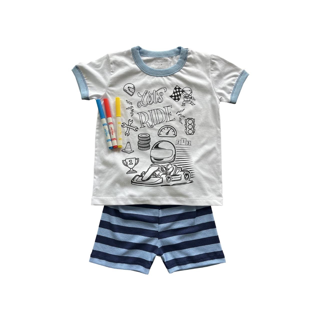 Pijama infantil confeccionada en 100 % algodón orgánico, hipoalergénica, suave y transpirable, ideal para el descanso nocturno. Incluye diseños para colorear que estimulan la creatividad de los niños, con crayones especiales para tela que no se borran al lavar. Hecha en Perú, con un diseño ligero y cómodo, perfecta para climas cálidos y para dormir o disfrutar en casa.